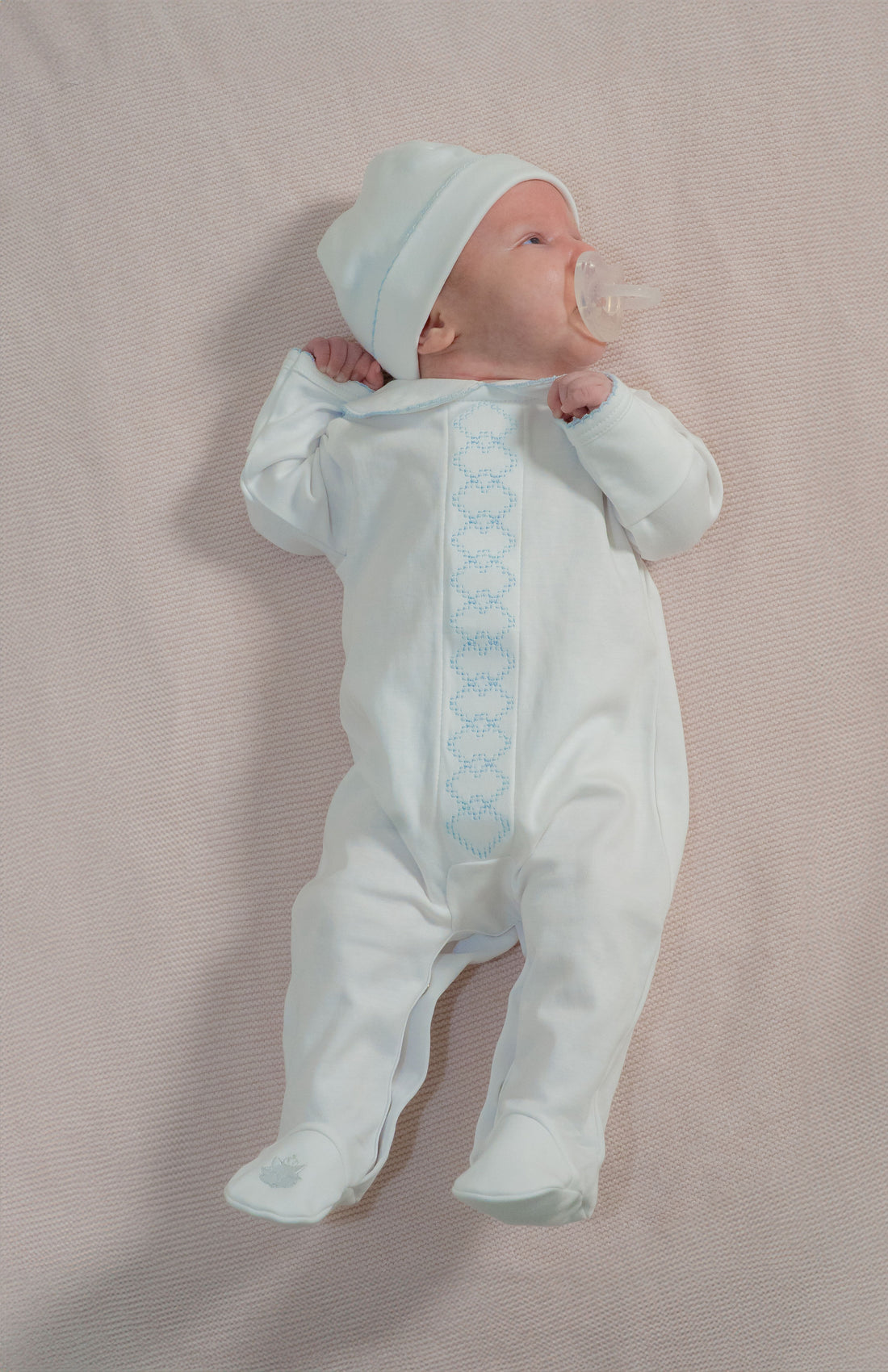 Light Blue Diamond Embroidered Baby Romper with Hat in Pima Cotton | Stylish Infant Outfit