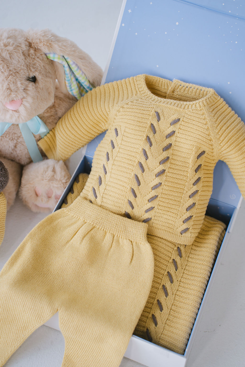 Wrap your little one in timeless elegance with our Tweed Dream 4-piece knitted gift set in MUSTARD COLOR. Thoughtfully designed for newborns, this collection includes a cozy sweater, matching pants, a charming bonnet, and a soft blanket. Each piece is crafted with care to ensure gentle comfort against delicate skin while providing warmth during cooler days. The harmonious color and classic tweed pattern offer a sophisticated look that’s perfect for both everyday wear and special moments. This set is an ideal gift for new parents seeking quality, style, and comfort for their baby’s early days.