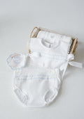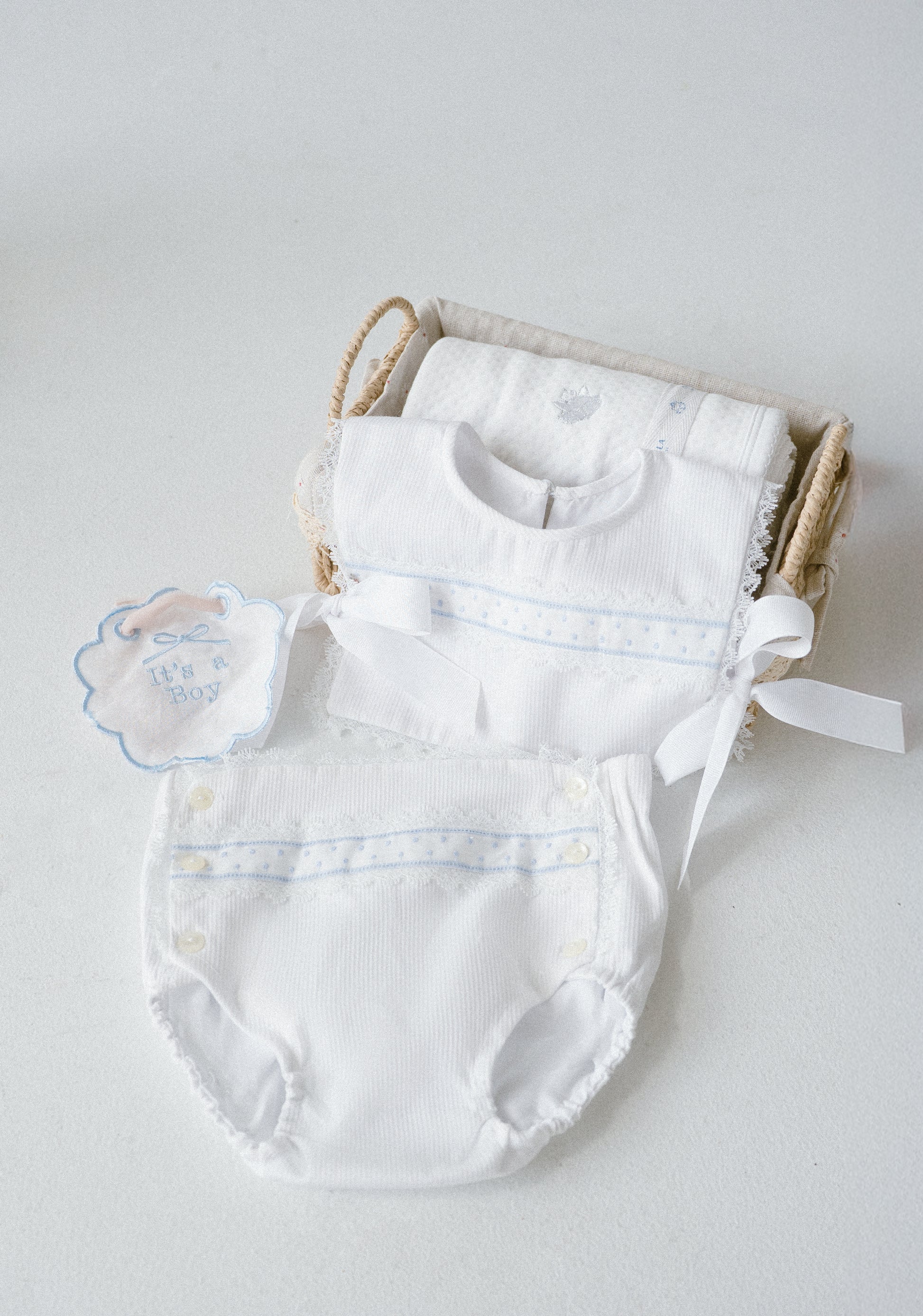Perfect for baby showers, newborn photos, or special occasions, this heirloom-quality set combines comfort with timeless Spanish design. The bib ties securely with wide grosgrain ribbons, and the bloomer features gentle elastic at the legs and waist, plus side button details for easy dressing.