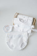 A charming and elegant set for your baby’s most precious moments. This two-piece set includes a soft, sleeveless bib with side ties and a matching bloomer, both crafted from premium white cotton with delicate lace trim and decorative ribbon in pastel blue or yellow.