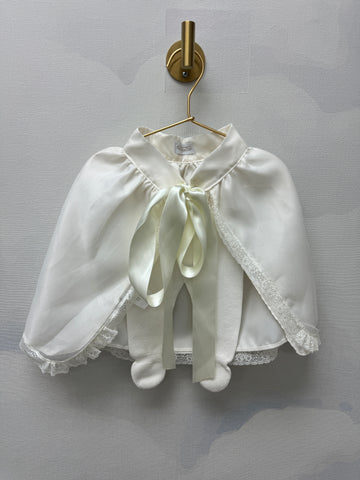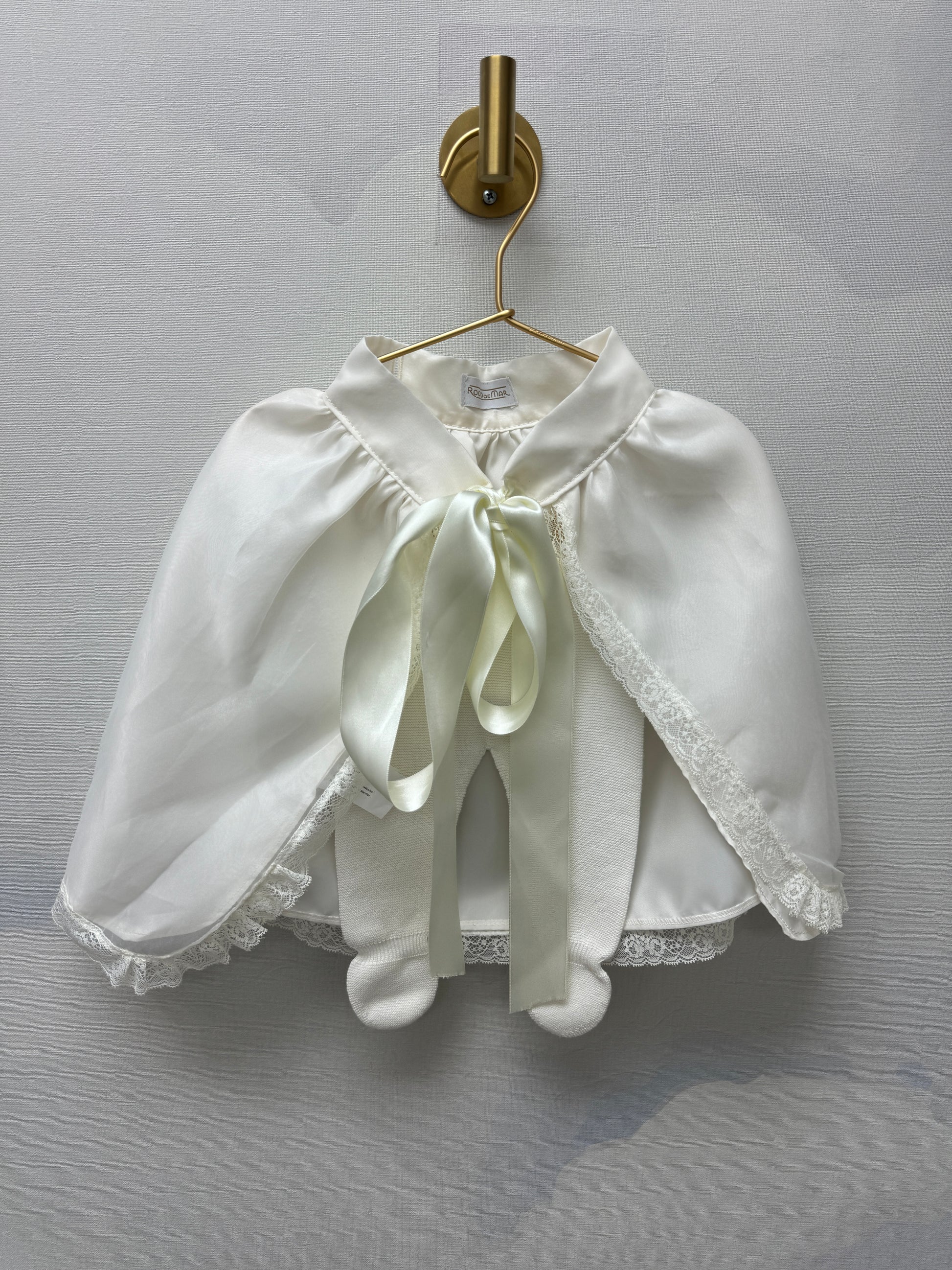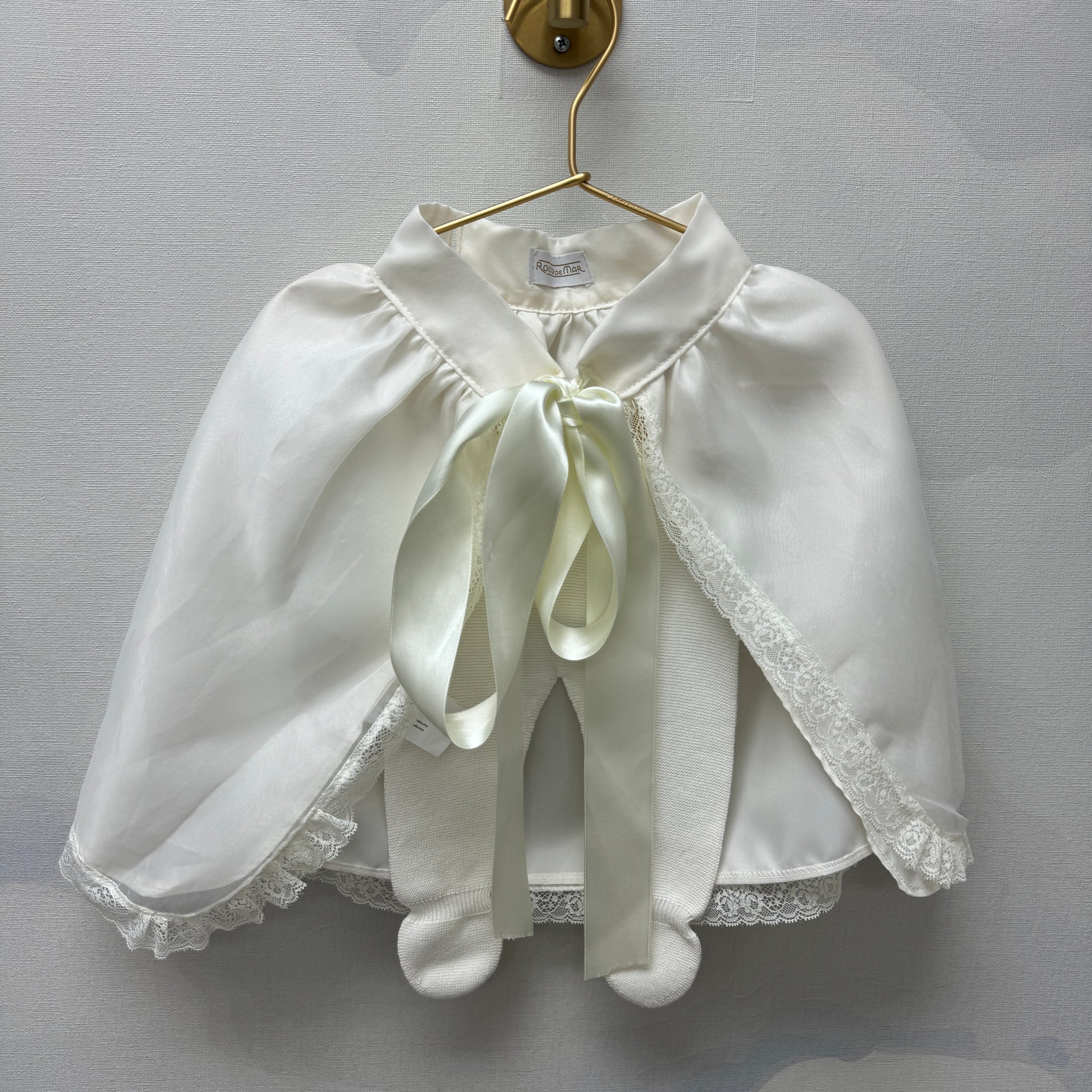 Wrap your newborn in elegance with our handcrafted Welcome Home Baby Skirt, designed to celebrate your baby's arrival in timeless style. Made in Spain from soft ivory satin and trimmed with delicate lace, this heirloom-quality piece ties gently with a wide satin ribbon for a secure and graceful fit.