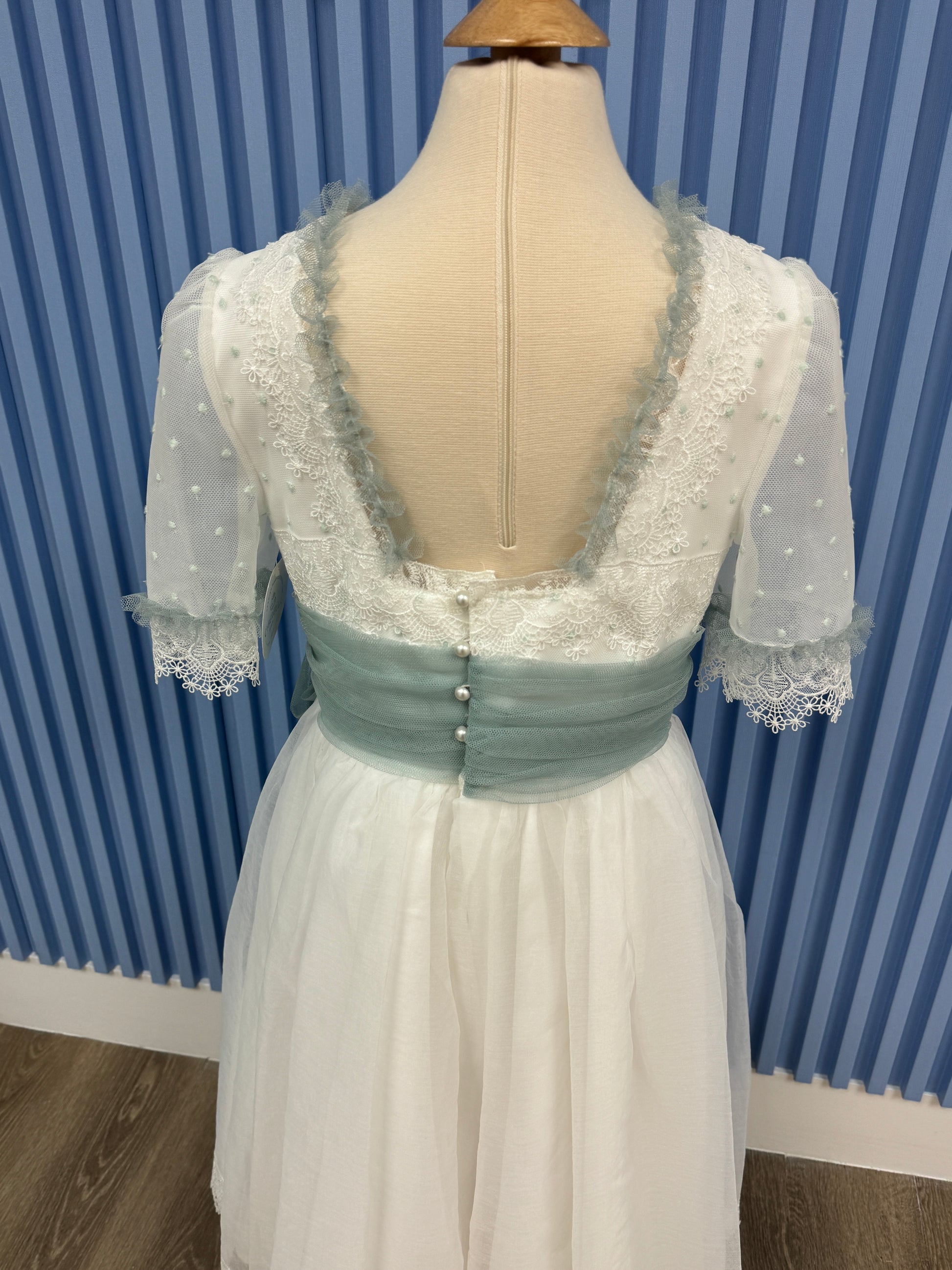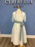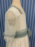 First Communion White Elegant dress with mint green polka dots and sash-#2105