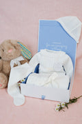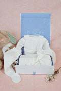 Soft, sweet, and utterly timeless—our Cream Puff set wraps your little one in warmth and elegance. This 4-piece ensemble includes a delicately knit top, matching footed pants, a charming bonnet, and a cozy blanket in the same dreamy ivory tone.