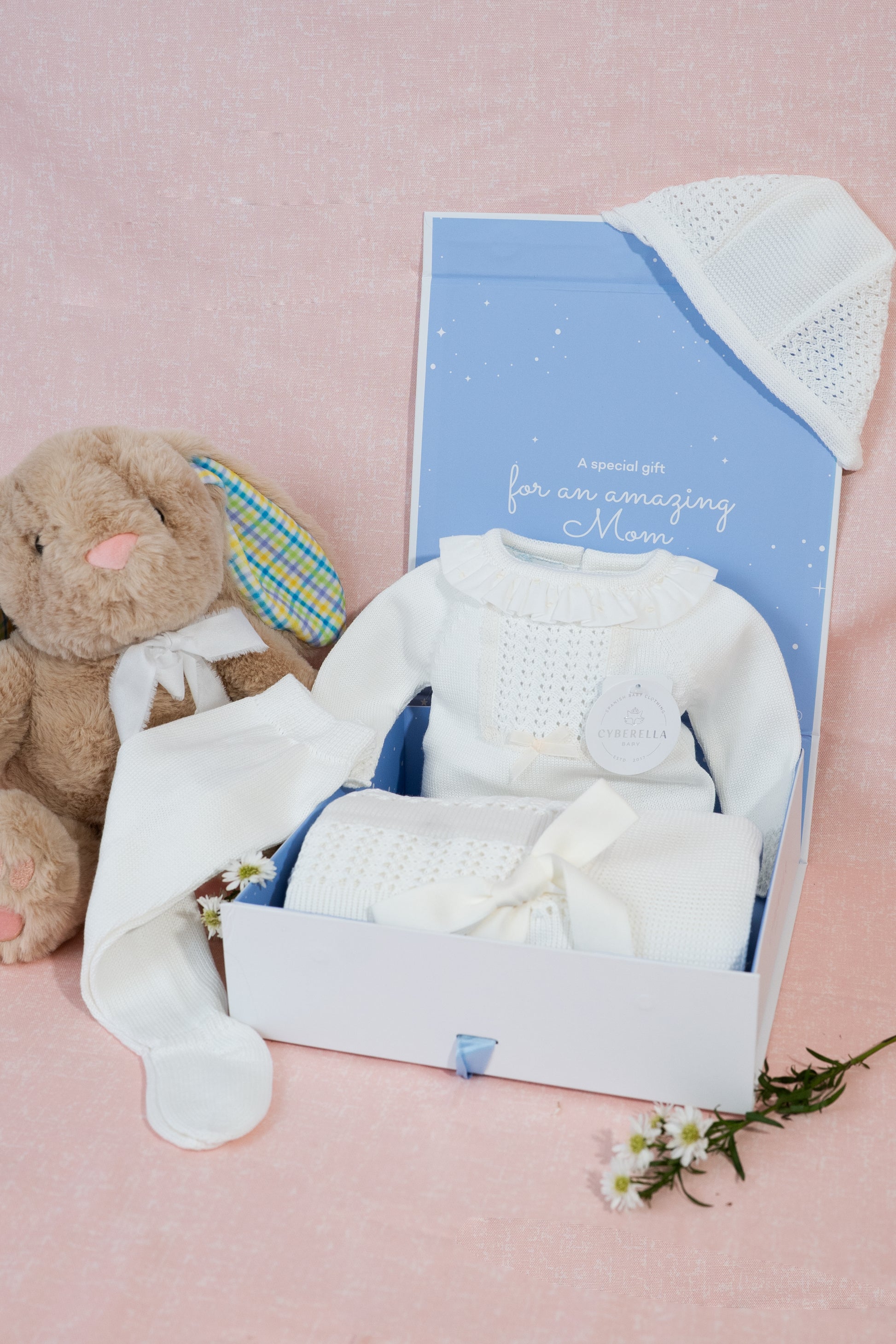 • Coordinating knit blanket with satin bow