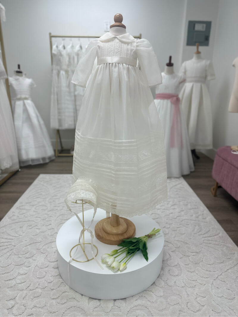 • Ivory baptism gown with matching baby hat – Classic and elegant, featuring delicate lace accents.