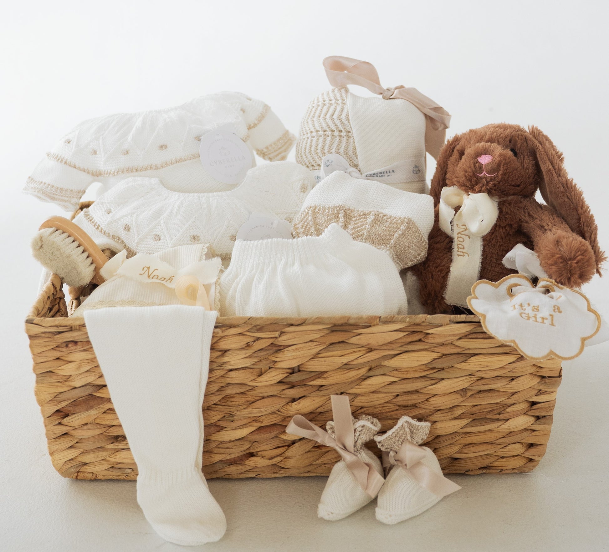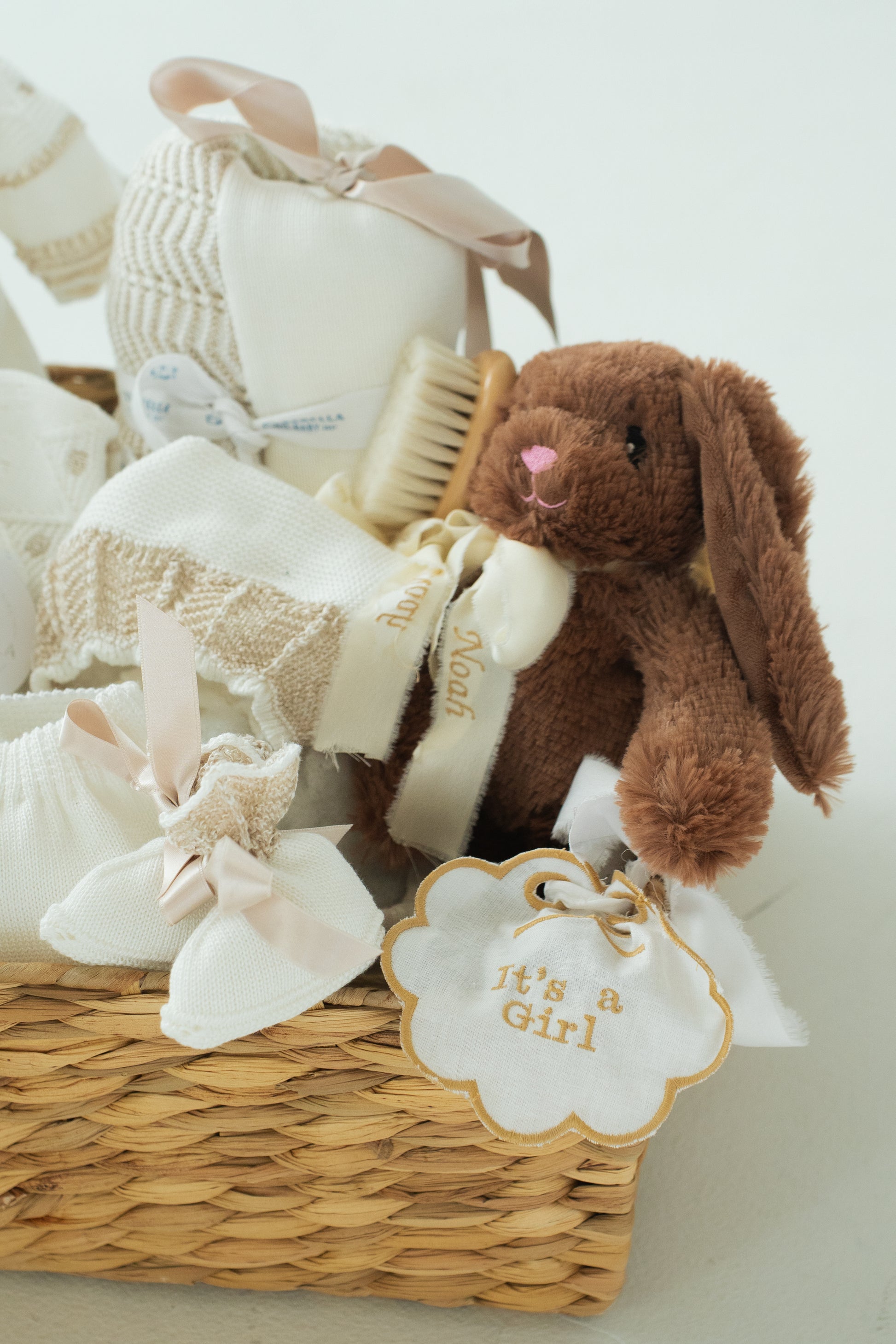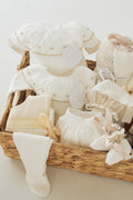 This beautifully curated baby basket is the perfect blend of timeless charm and thoughtful detail. It includes: