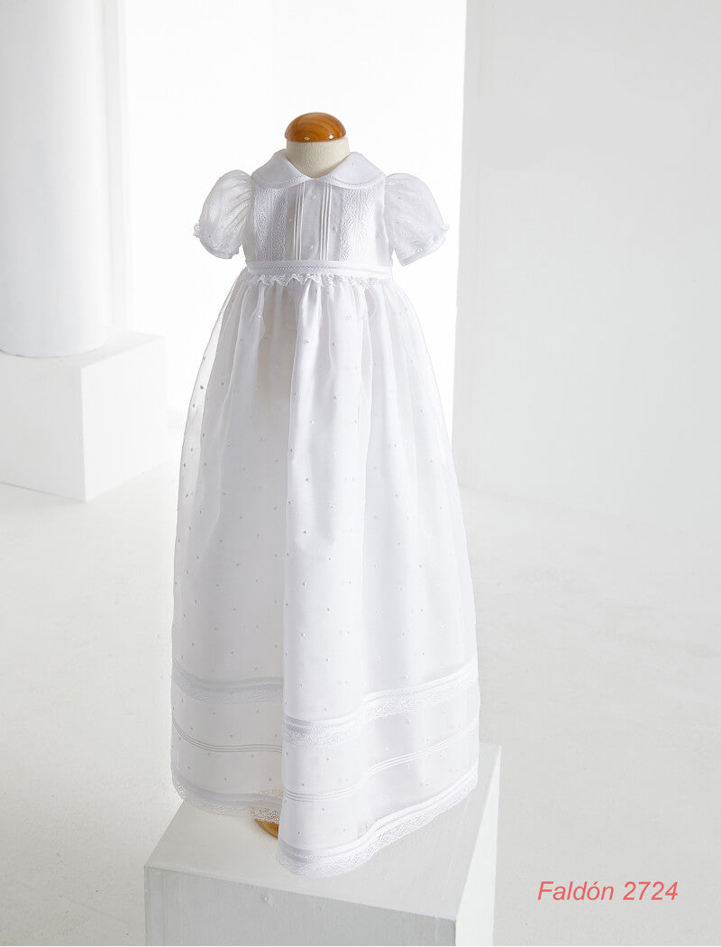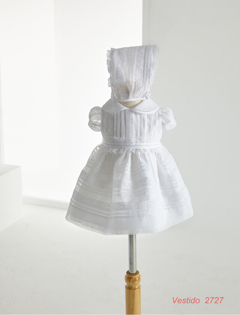 • Long christening gown with matching bonnet – Made of soft organza with intricate lace accents.