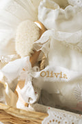 • Burp cloth with embroidered cross – Soft, absorbent, and delicately trimmed with lace.