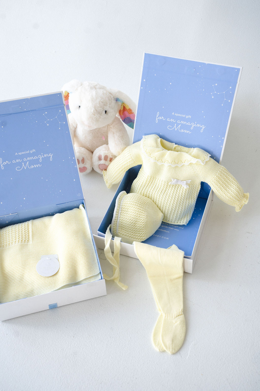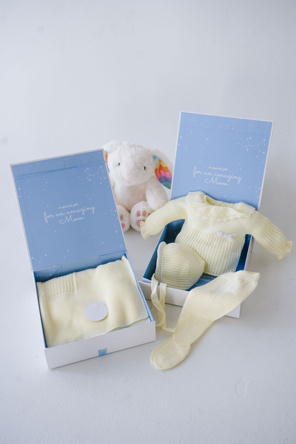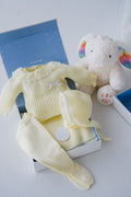 The Dreamy Powder Knit Baby Set provides a soft, tender feel that’s gentle on a newborn’s sensitive skin. This sweet outfit combines comfort and cuteness, featuring a snug sweater with coordinating pants, a charming bonnet, and a cozy blanket to keep your little one warm and comfortable.