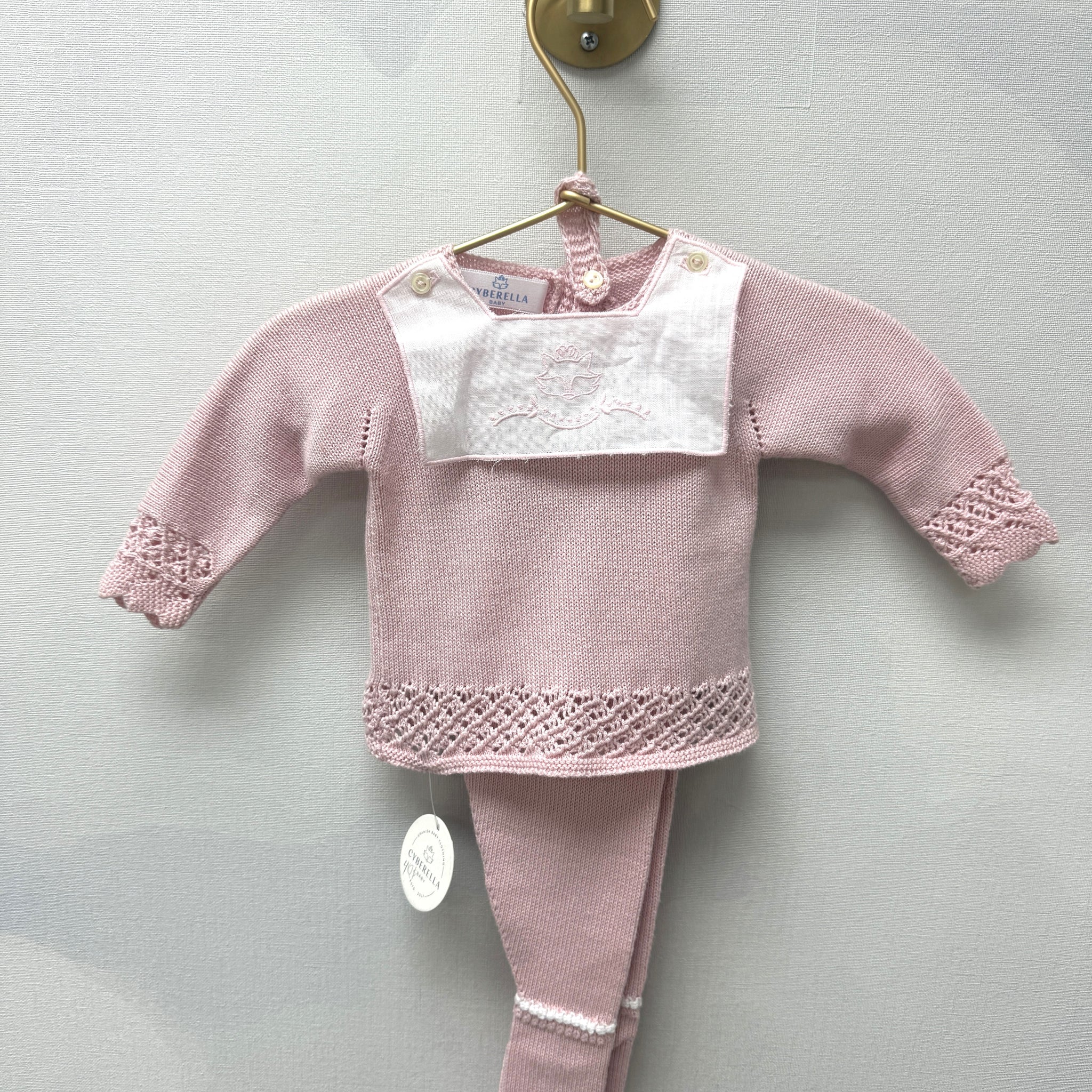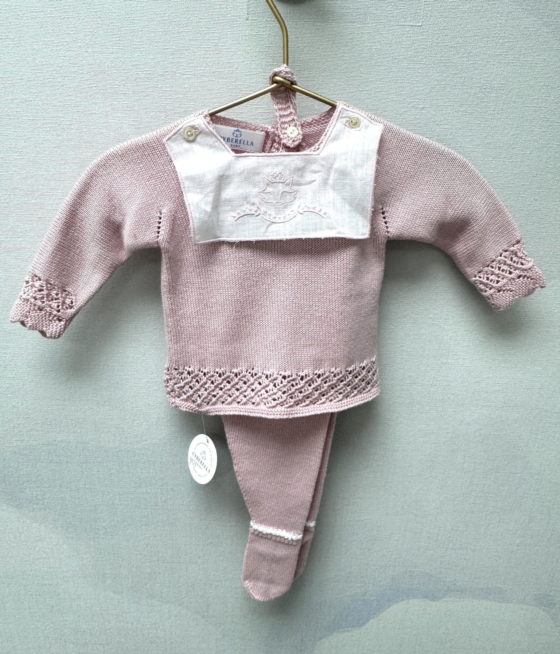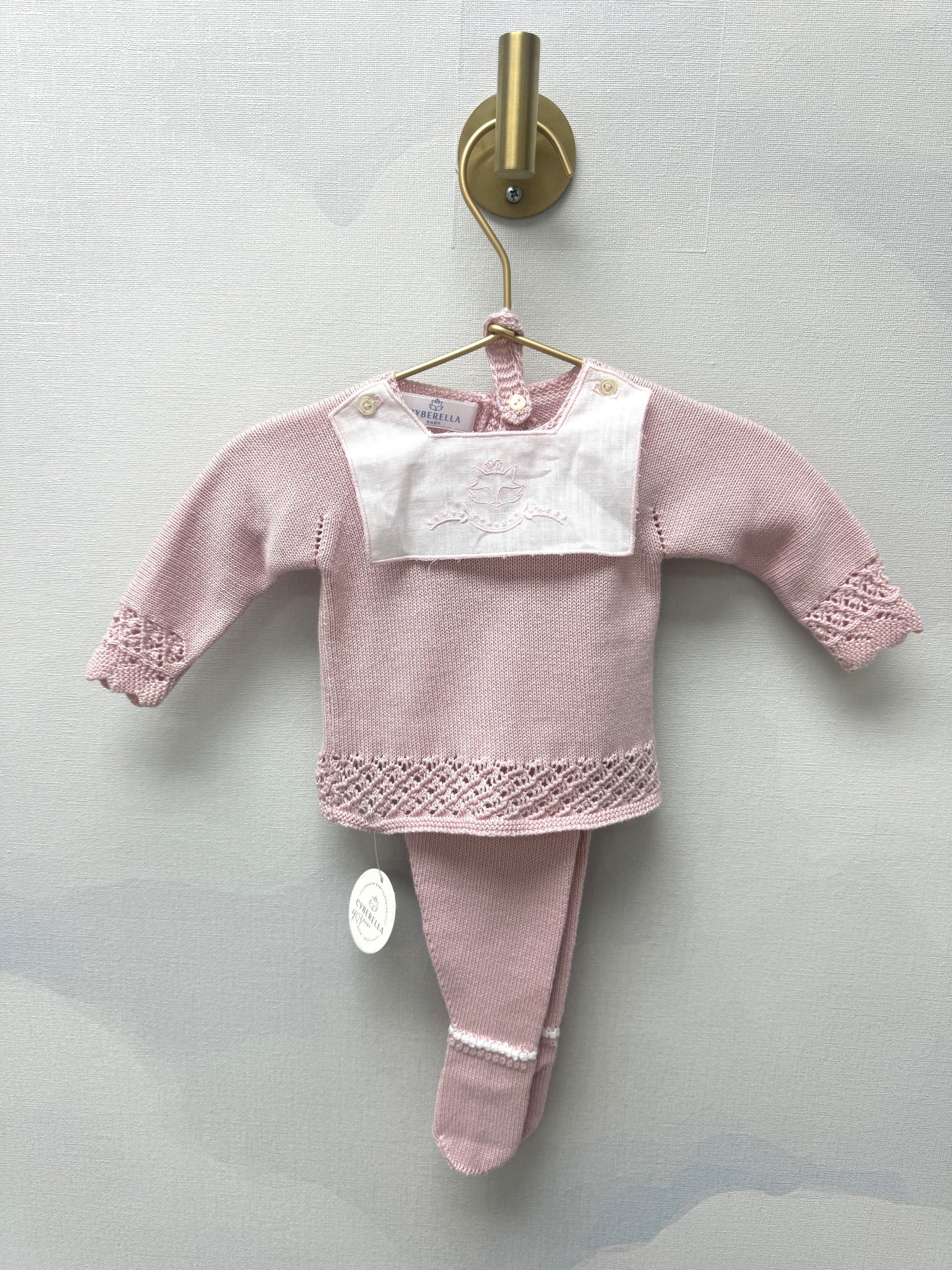 3-Piece Dusty Pink Knit Baby Set with Embroidered Fox Bib – By Creaciones Dybvarella
