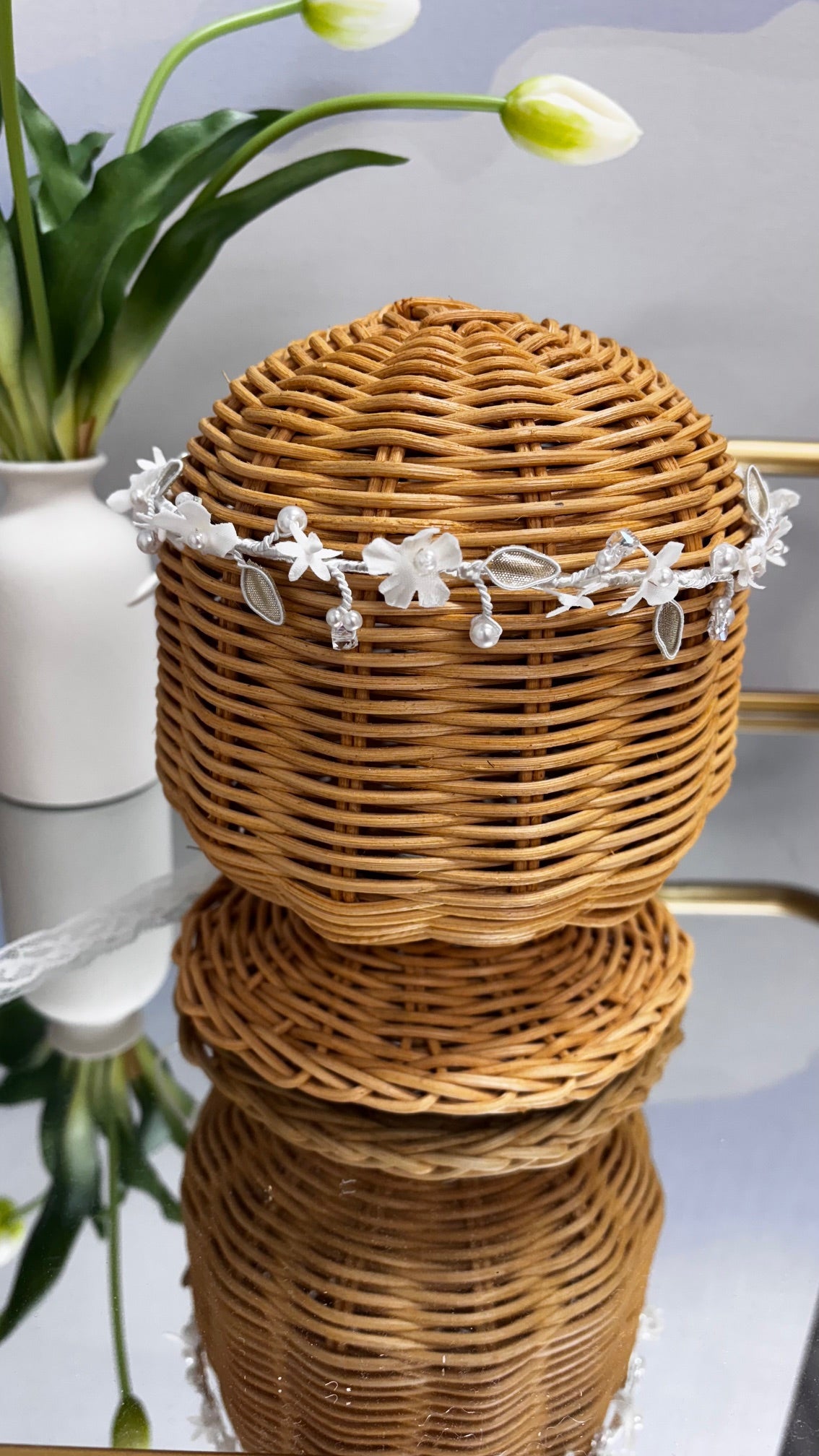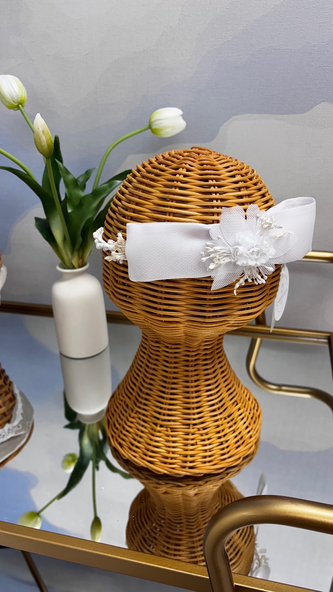 Gracefully crafted for a day to remember, this First Communion crown is the perfect finishing touch for your little girl's special moment. Featuring a delicate arrangement of white flowers, satin ribbons, and pearl details, this crown offers a timeless and elegant look.