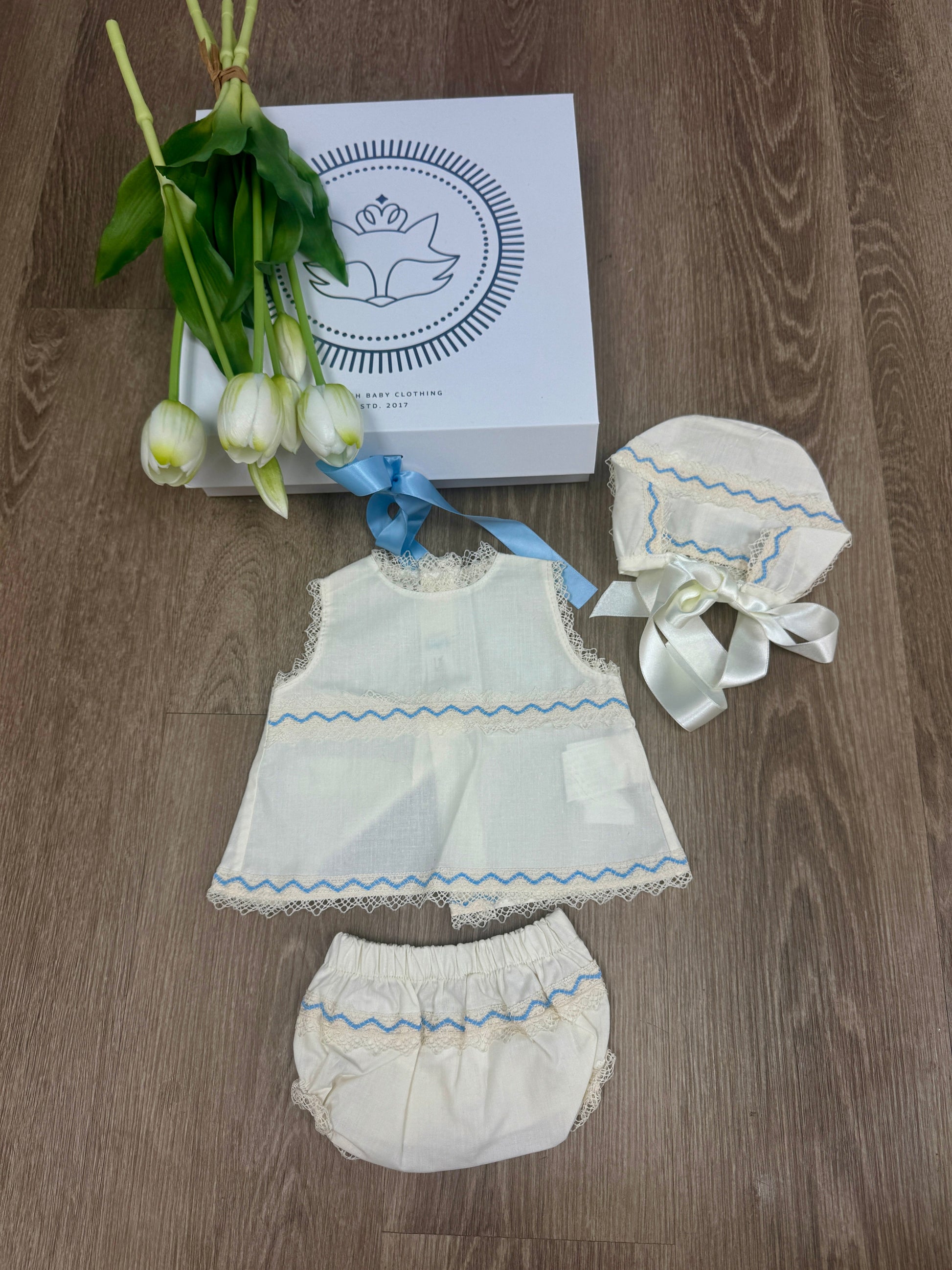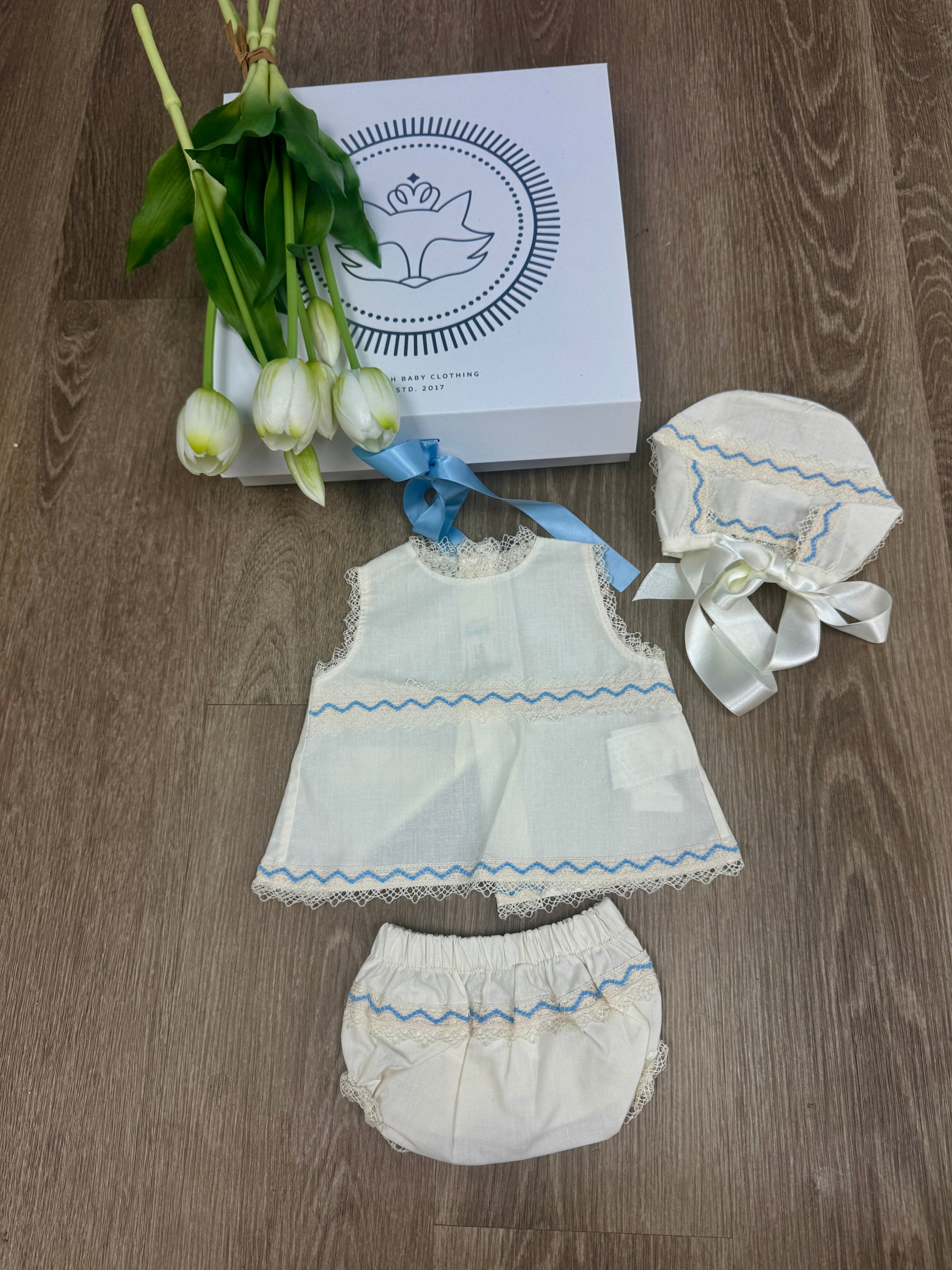 This adorable baby outfit includes a sleeveless blouse, matching bloomer, and bonnet—beautifully handcrafted with delicate lace trim and colored zigzag ribbons. Available in soft blue or pink, it's perfect for special occasions or as a thoughtful newborn gift.