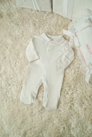 White Pima Cotton Romper with Pink Hand-Embroidered Neckline