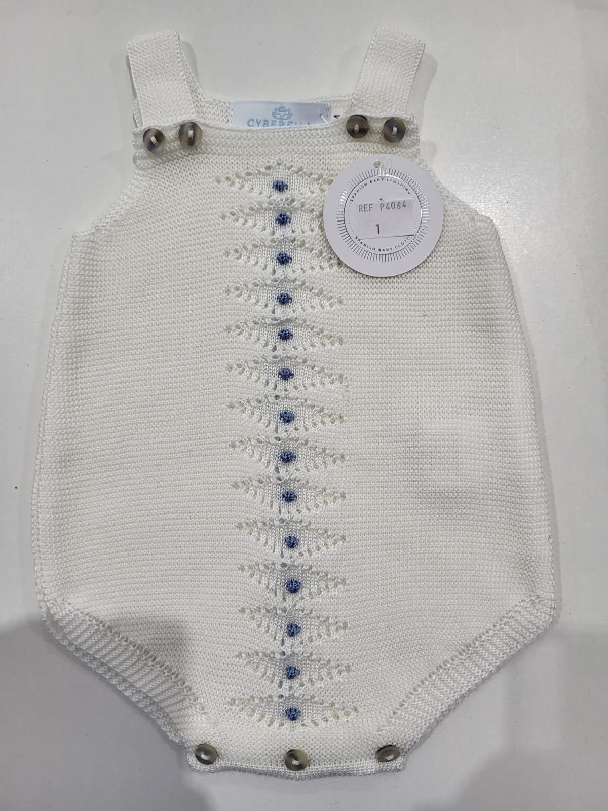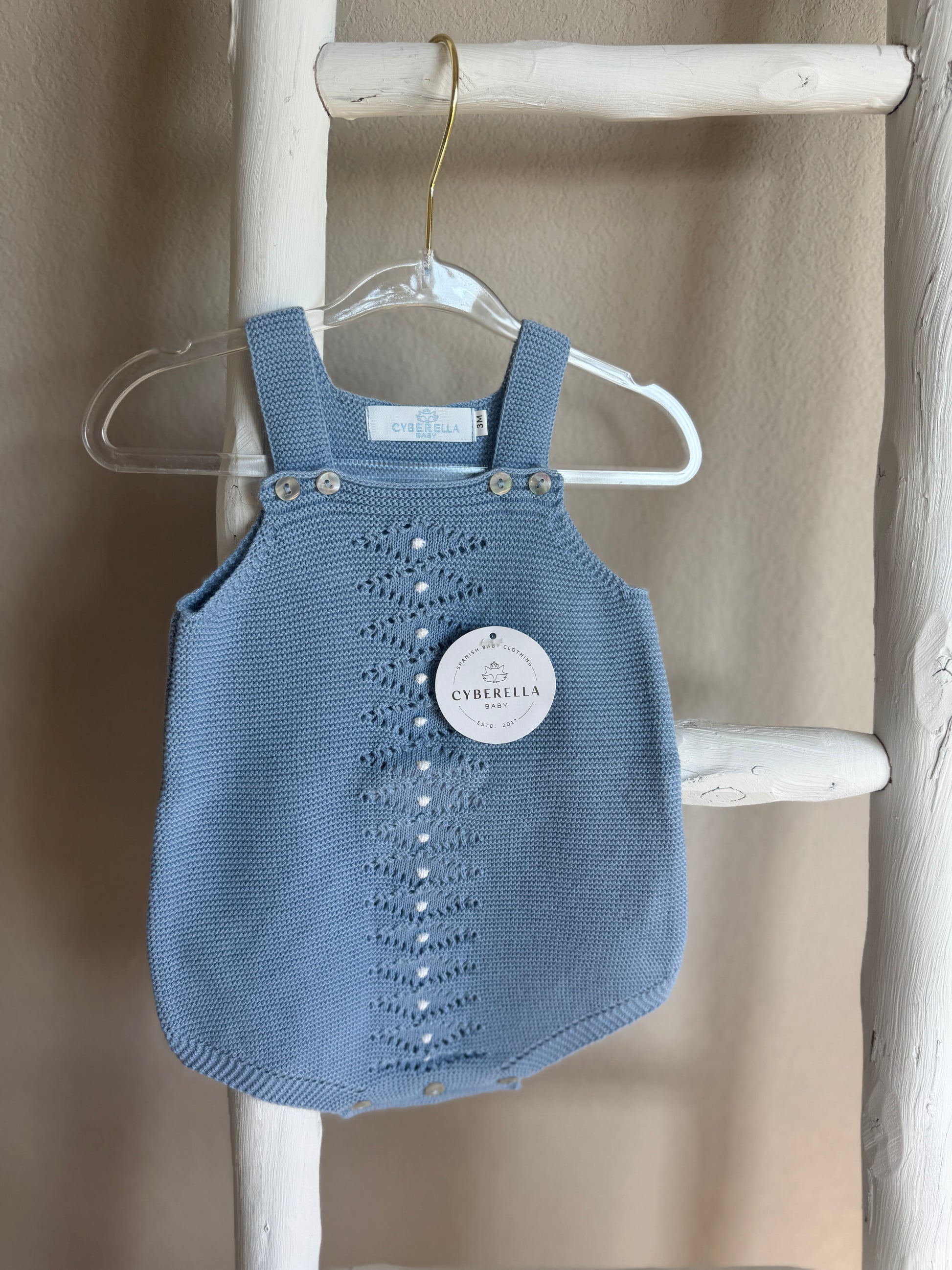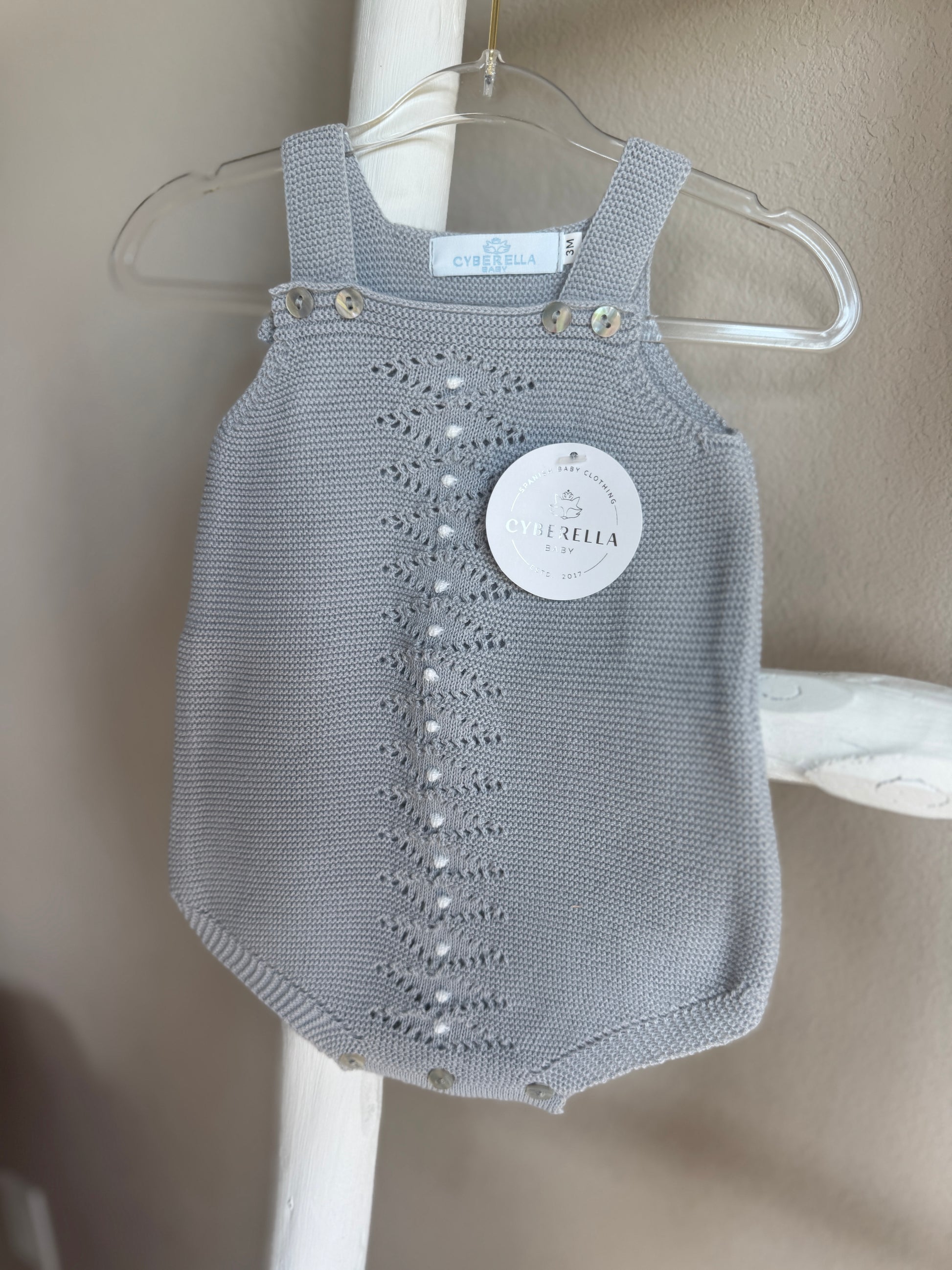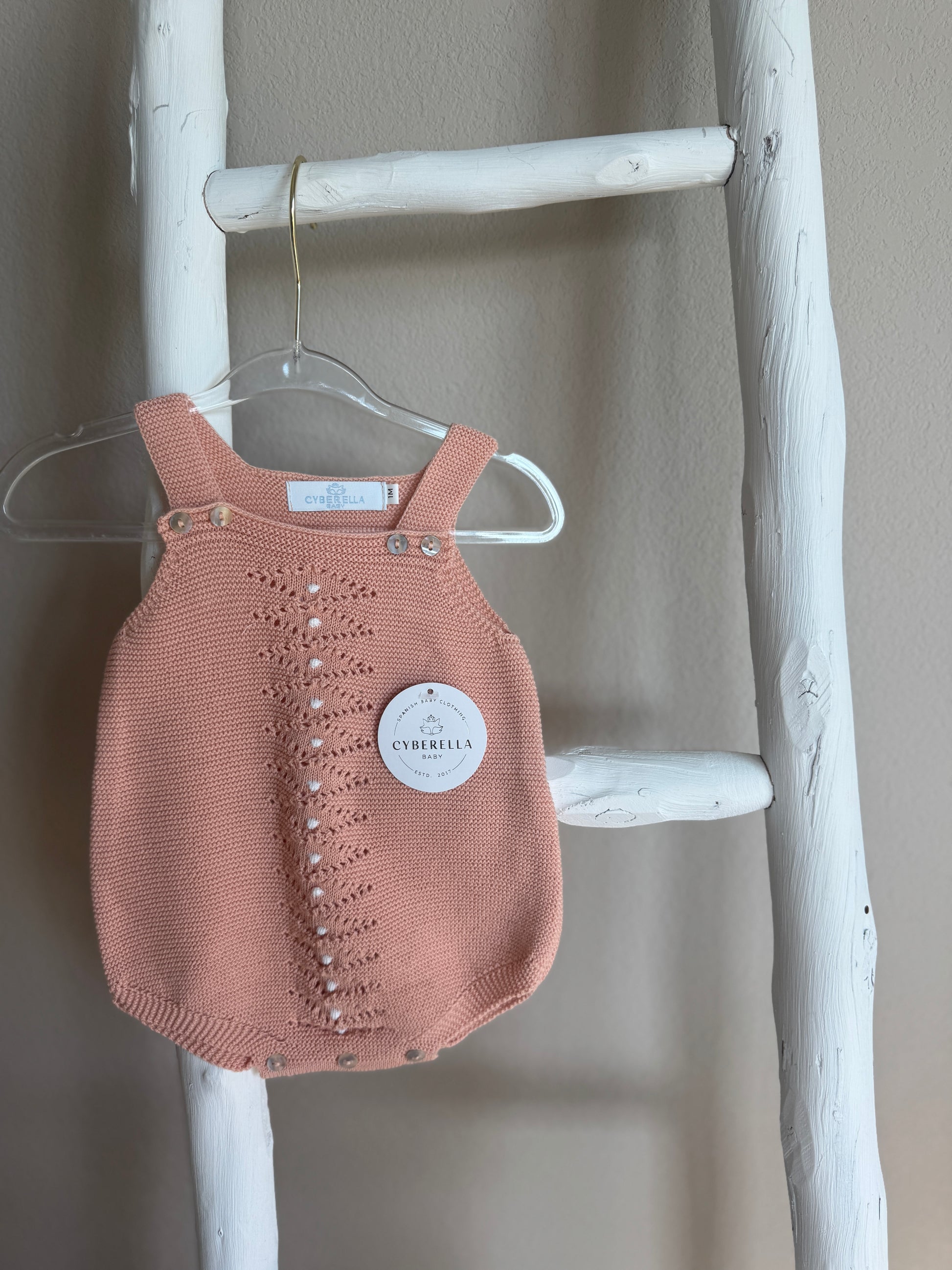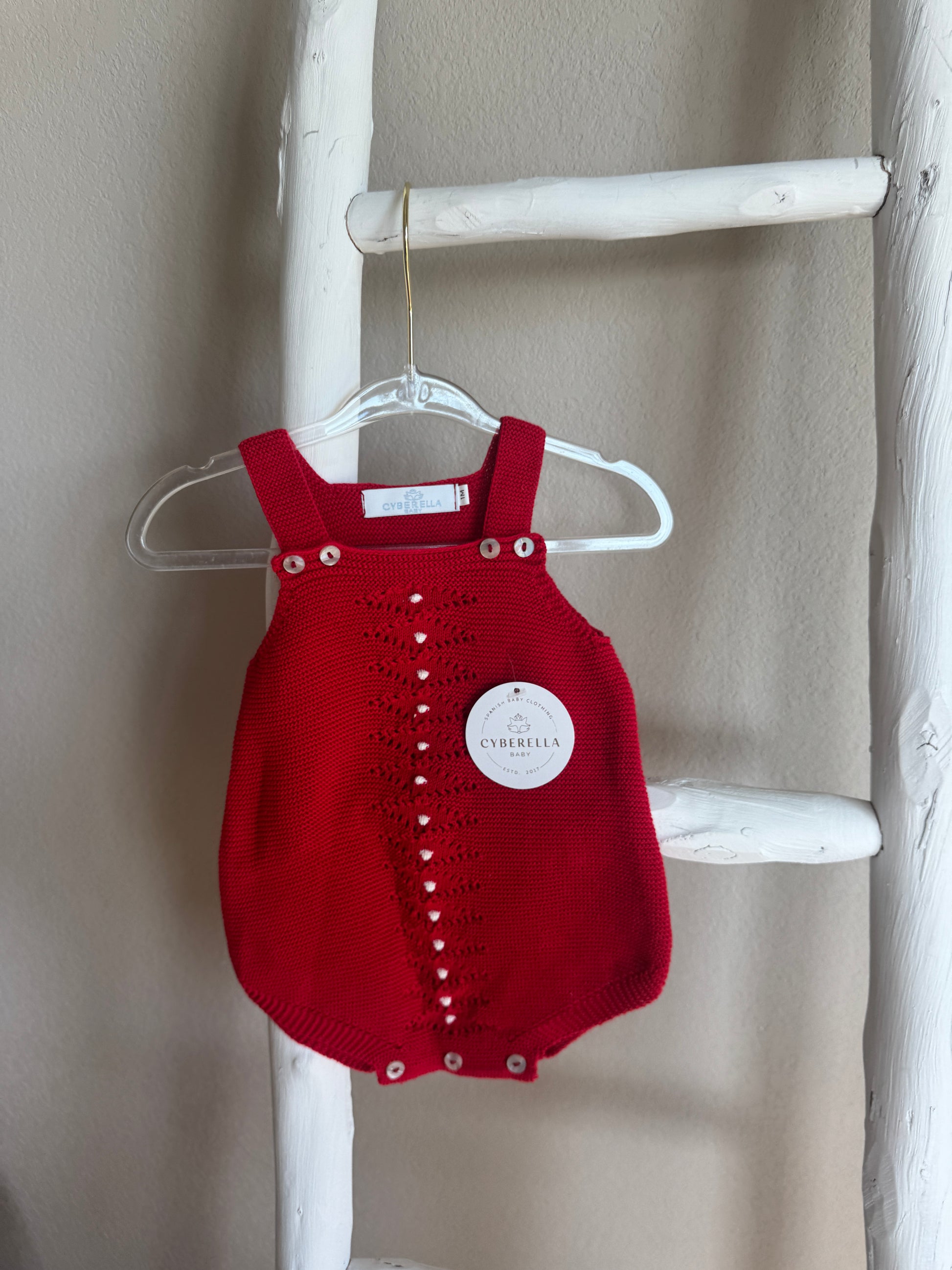 This adorable knit baby romper features a charming vertical openwork pattern accented with classic white polka dots for a touch of whimsy. Designed with secure button straps and bottom snaps for easy dressing and diaper changes, this piece blends comfort, practicality, and style.
