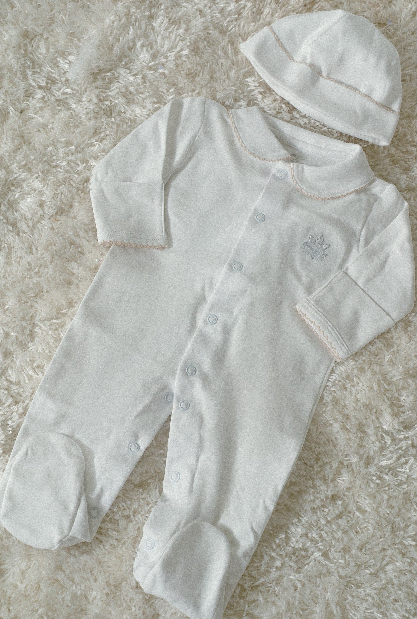 Dress your baby in our White Pima Cotton Romper with Light Blue Hand-Embroidered Neckline for a look that is both sophisticated and charming. Shop now to secure this exquisite piece for your little one!