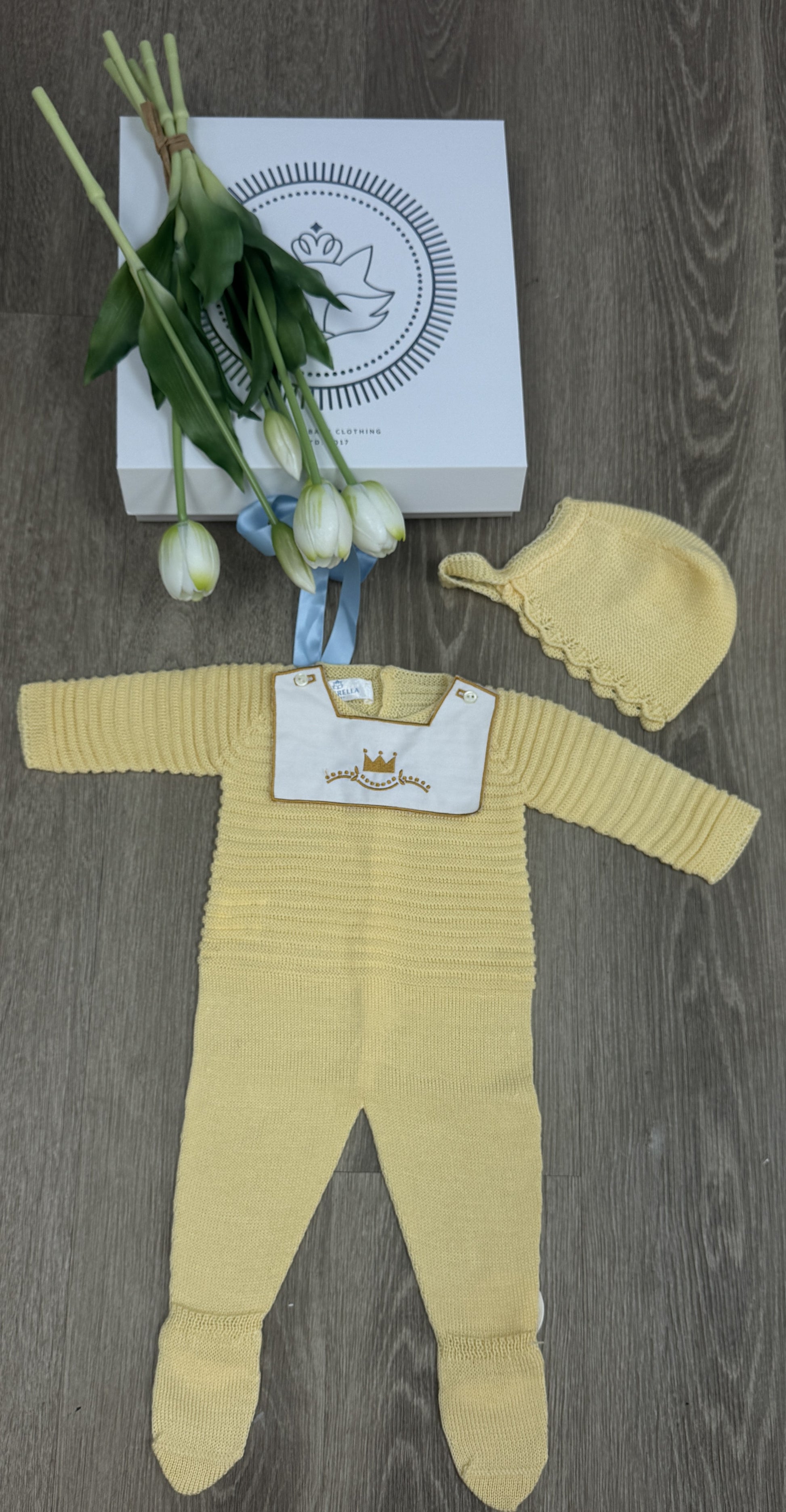 Brighten up your baby’s wardrobe with this charming yellow knit romper, complete with a matching hat for an extra sweet touch. Crafted in Spain with soft, breathable fabric, this set is perfect for keeping your little one cozy and stylish during any season.