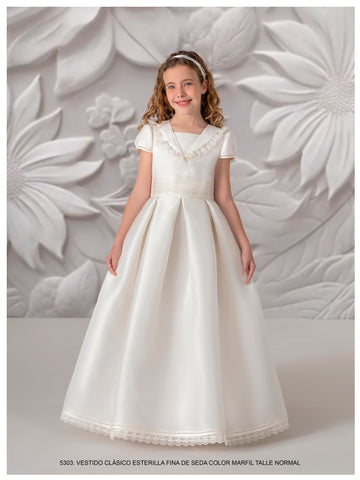 Introduce timeless elegance to your child's special day with our Model 5303 classic first communion dress. Made from esterilla fina de seda in a soft ivory hue, this dress features a standard fit for comfort and sophistication during any first communion ceremony.
