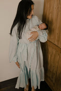 The linen and cotton combination ensures a soft, pleasant texture while providing excellent breathability, keeping you comfortable all day long. Designed with elegance and simplicity in mind, this robe features discreet openings at the bust for easy breastfeeding access, making it both functional and stylish.