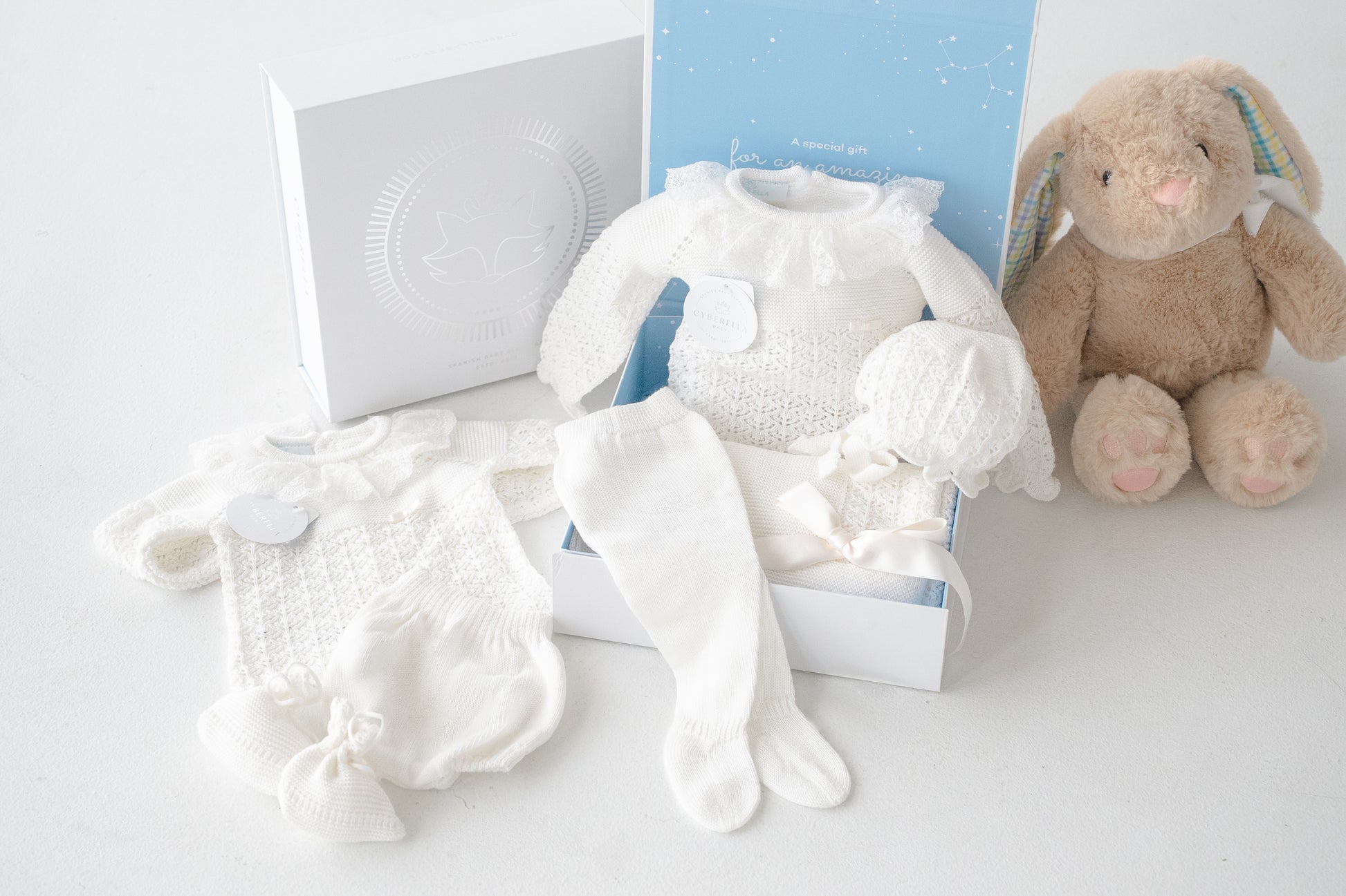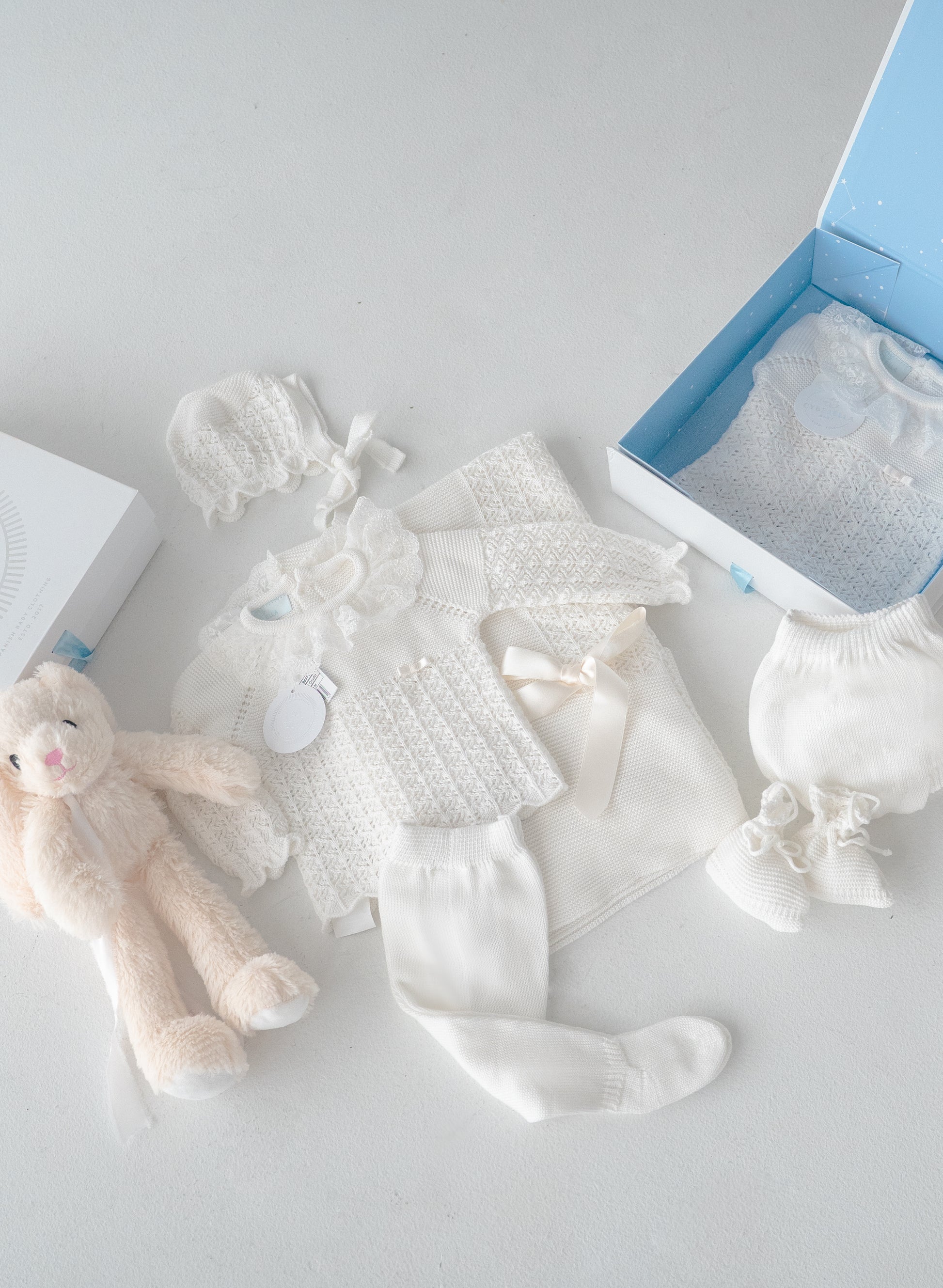 Wrap your little one in timeless elegance with our handcrafted 7-piece baby set, made in Spain from the softest cotton knit in a delicate ivory shade.