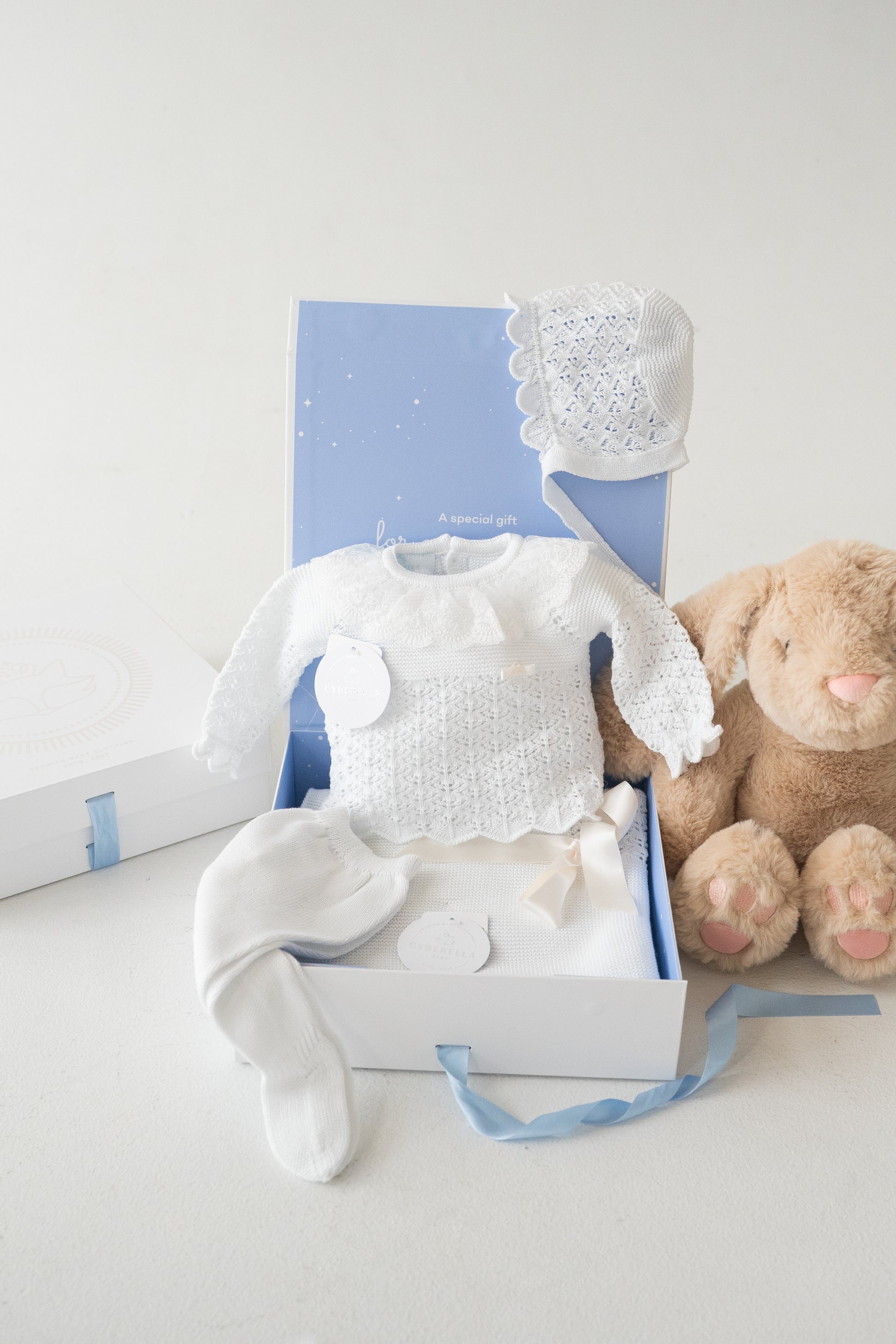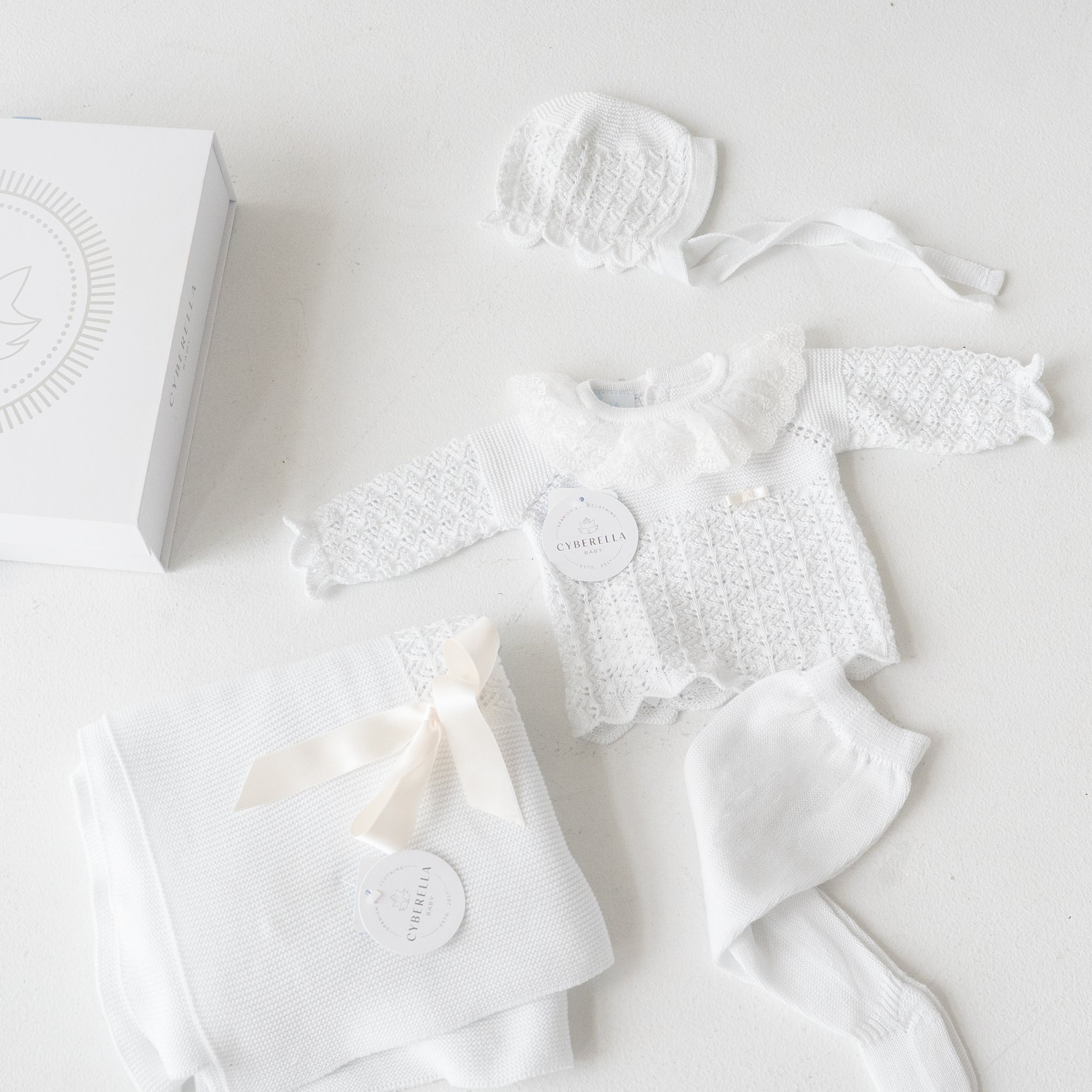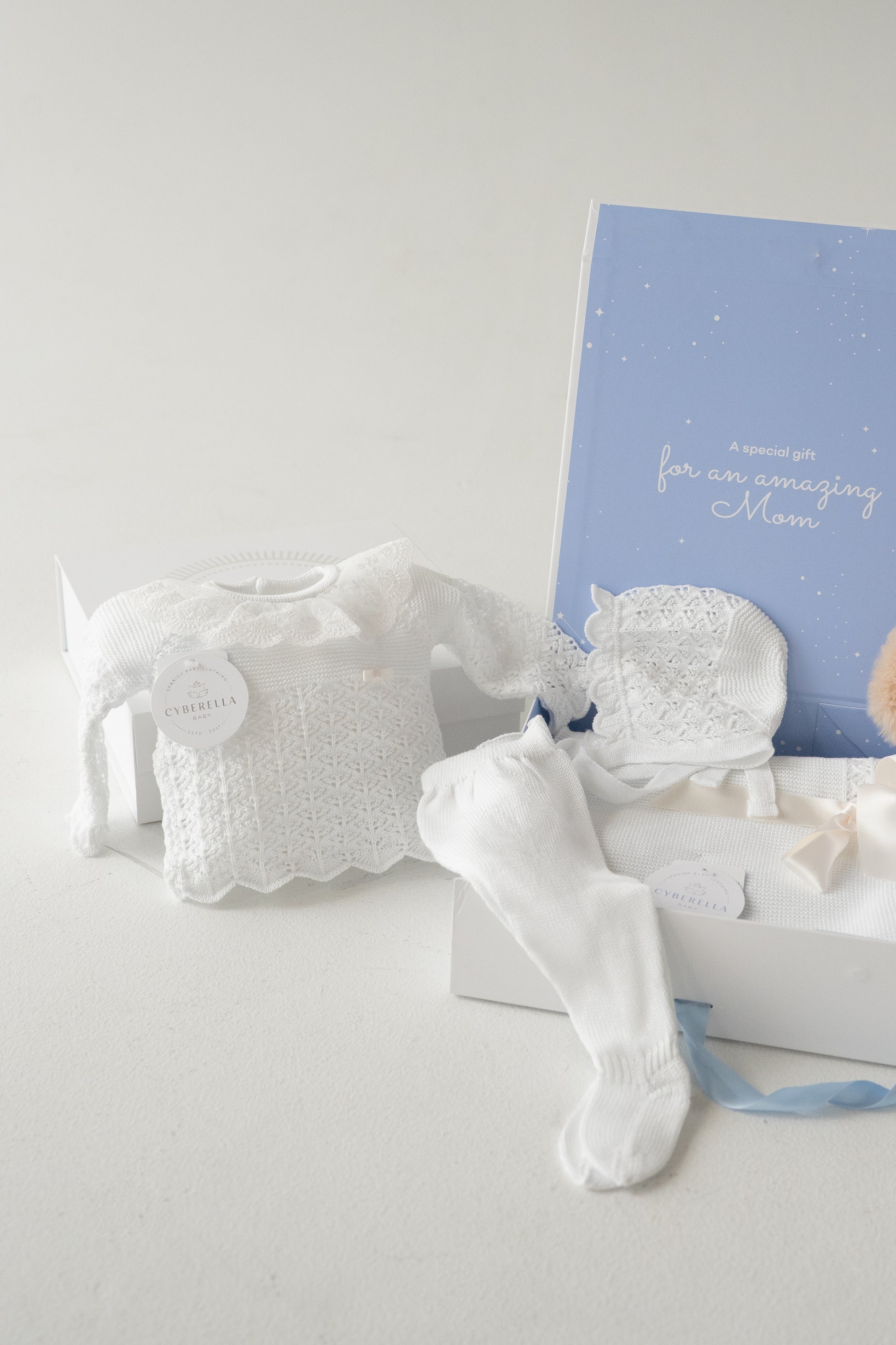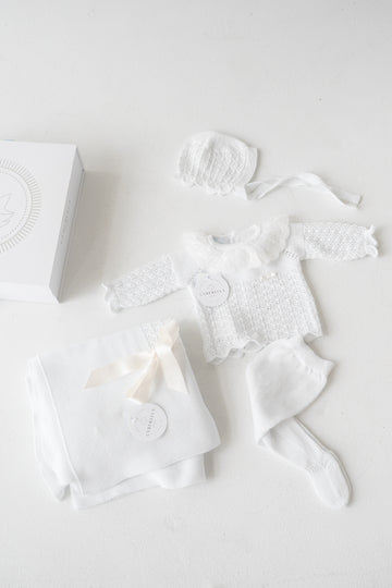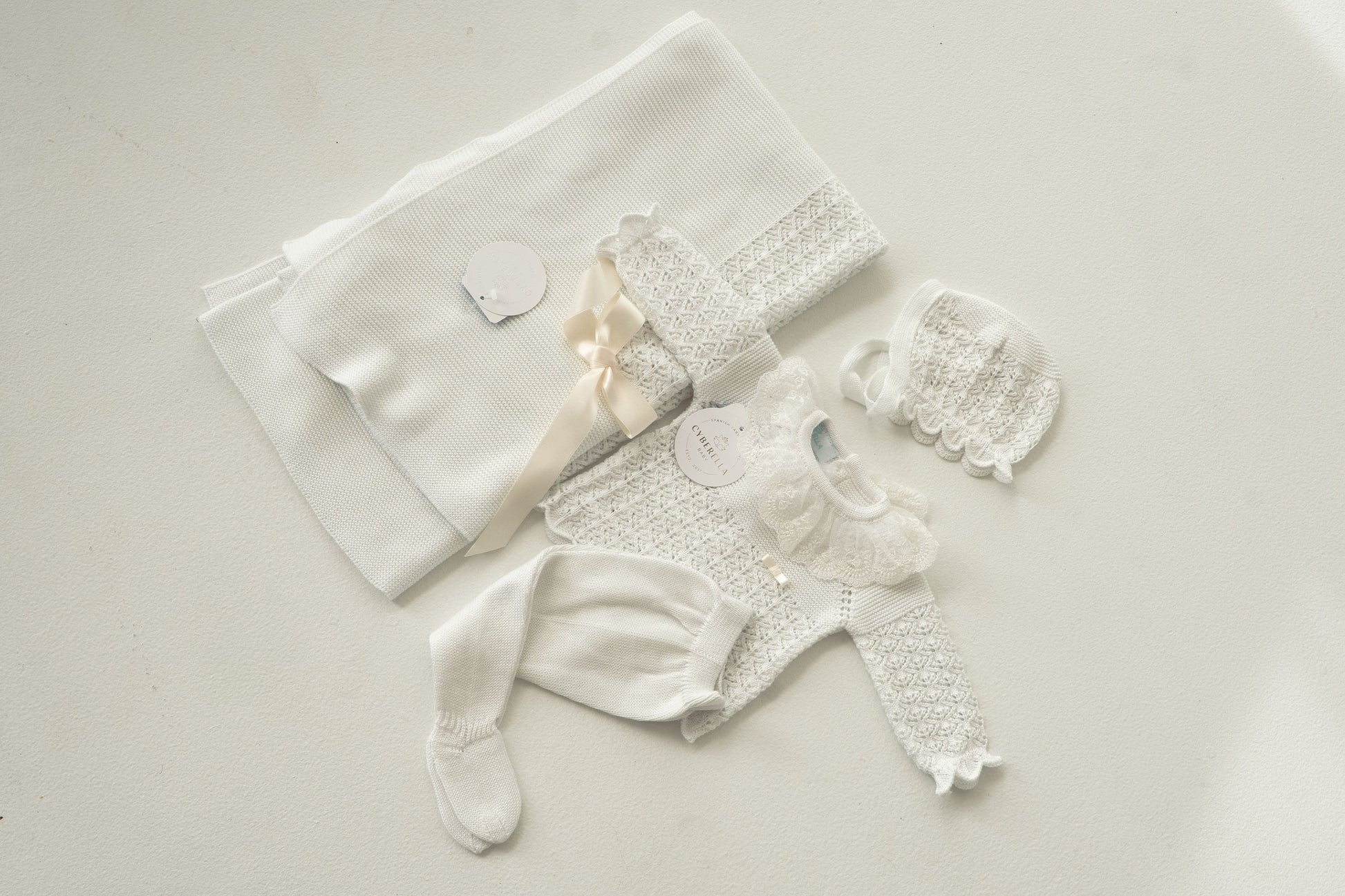 Wrap your little one in timeless elegance with our Whispering Cream gift set. This 4-piece collection is thoughtfully curated for newborns and includes: