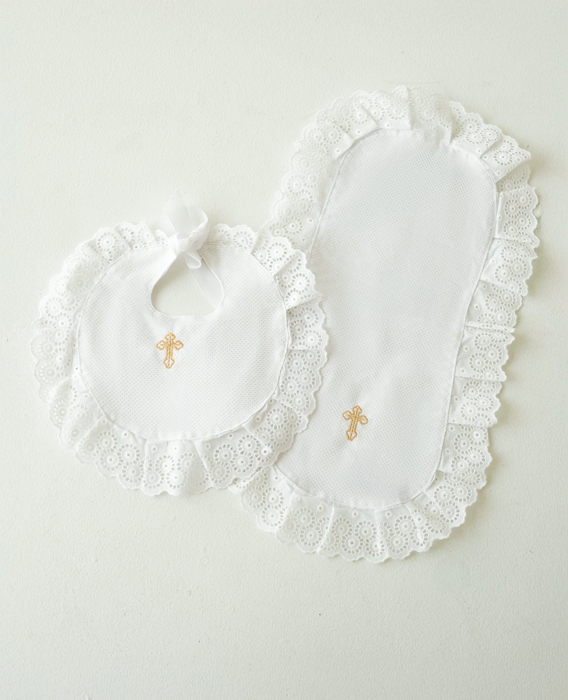 White Baptism Bib and Burp Cloth Set with Gold Cross Embroidery