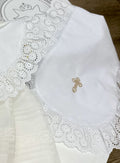 This refined white burp cloth adds a sacred touch to your baby’s baptism or christening ceremony. Crafted in Spain, it features soft textured fabric trimmed with delicate eyelet lace and is finished with an embroidered gold cross. Elegant yet practical, it's designed to gently protect both baby and caregiver during special moments.